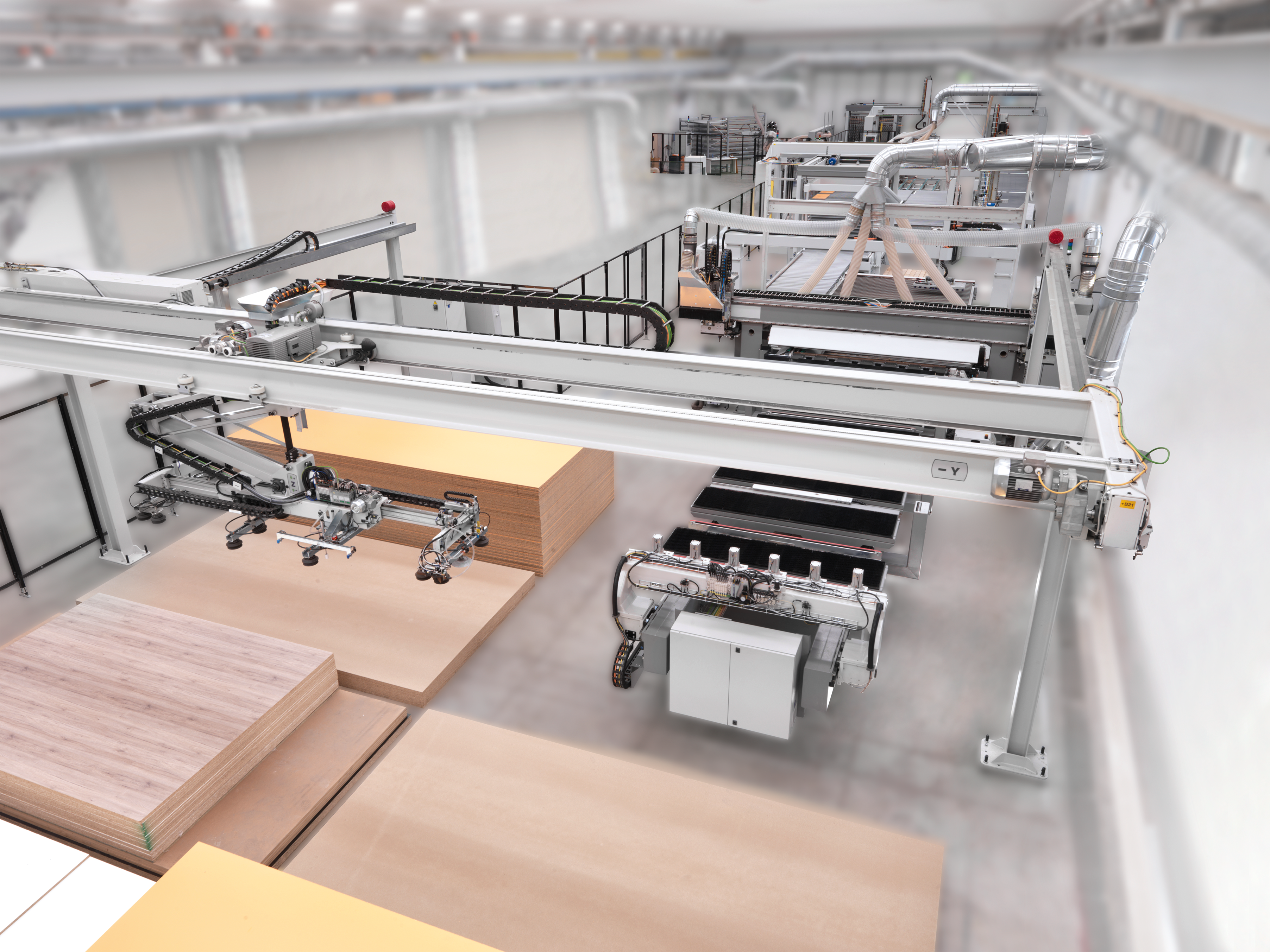 Každý panel je bezpečne zdvíhaný pomocou vákuových prísaviek s presným riadením, čo zaisťuje bezpečné manipulovanie s citlivými laminátmi, MDF, drevotrieskou alebo preglejkou bez rizika poškriabania, pretlačenia alebo deformácie materiálu.