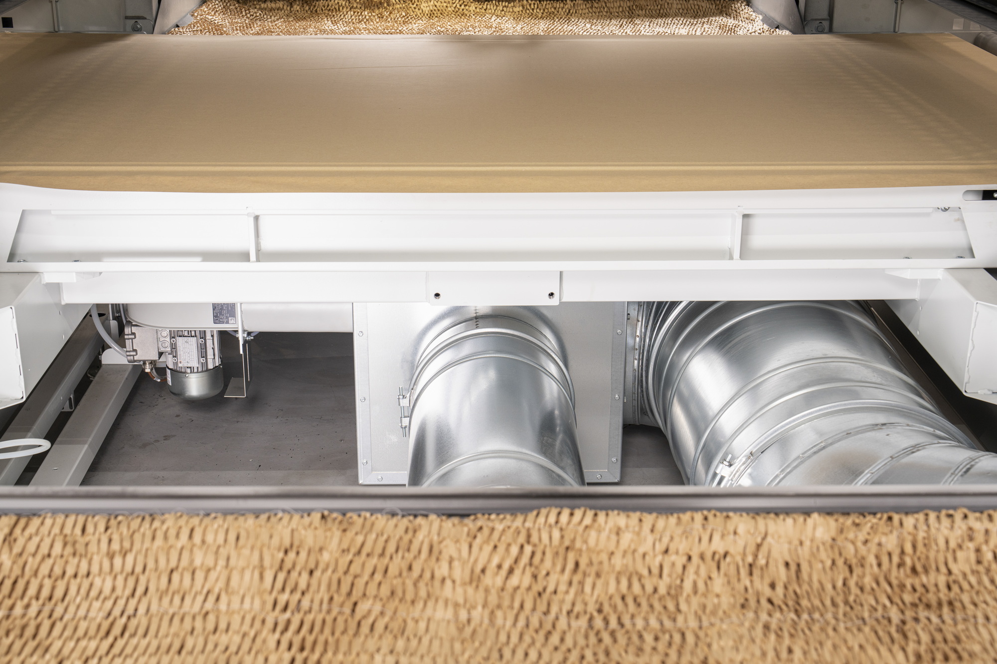 Papierový dopravný systém s automatickým odvíjaním a navíjaním je vybavený vákuovou jednotkou, ktorá poskytuje všetky výhody kontinuálneho dopravníka: dokonale čistú spodnú stranu panelu a rovnomernú aplikáciu na hrany aj plochu obrobkov. Papierové rolky sú umiestnené na vstupe a výstupe, čo umožňuje ich rýchlu výmenu.