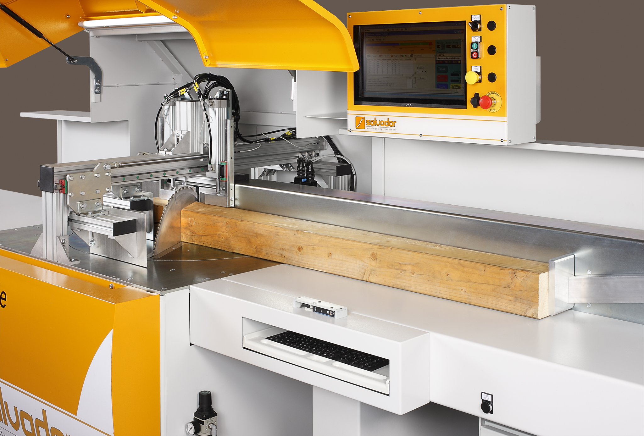 Materiál je privádzaný na vstupný stôl a následne je posúvaný do reznej zóny, kde pílová jednotka vykonáva rezy na požadovanú dĺžku a pod nastaveným uhlom. Stroj umožňuje presné nastavenie uhla rezu, čo je vhodné napríklad pri výrobe konštrukčných prvkov alebo rámových dielcov. Vďaka stabilnej konštrukcii, presnému vedeniu materiálu a možnosti nastavenia pracovných parametrov je proces rezania rýchly, presný a vhodný pre rôzne typy drevených prvkov.