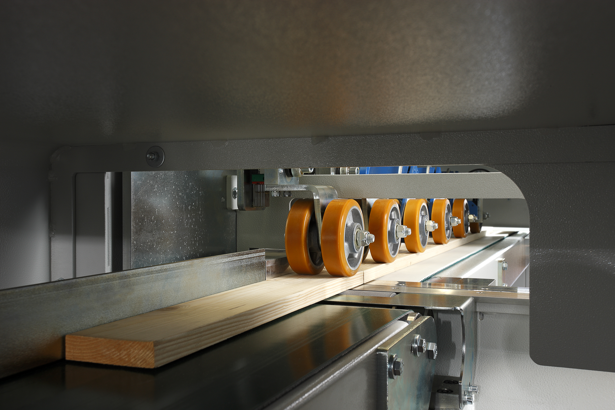 Supercut 100 je revolučný stroj z hľadiska pomeru maximálnej hodnoty získanej za peniaze. Jedinečný systém podávania prostredníctvom ozubeného remeňa s pásom zaisťujúcim maximálnu priľnavosť spracovávaného materiálu. Prítlačný systém je tvorený radom veľkopriemerových koliesok s automatickým riadením tlaku. Vertikálny posuv valčekov umiestnených pred a za kotúčom je priamo zaisťovaný elektronickými a pneumatickými komponentmi.