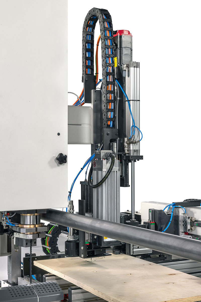 Vďaka unikátnej konštrukcii s natáčaním pílového pásu umožňuje automatické vyrezávanie zložitých tvarov, vrátane ostrých rohov, bez nutnosti ručného značenia materiálu. Stroj je navrhnutý pre efektívnu sériovú výrobu a spracovanie veľkých panelov alebo viacerých kusov materiálu naraz. CNC riadenie zabezpečuje presné vedenie rezu, vysokú kvalitu opracovania a rýchle prepínanie medzi jednotlivými výrobnými programami.